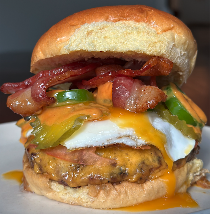 Larry’s Latest Homemade. Organic grass-fed 80/20 beef, sharp cheddar, cherrywood smoked uncured bacon, jalapeños, habañeros, pickles, red onion, tomato, runny egg, spicy mustard/spicy mayo special sauce on a brioche bun